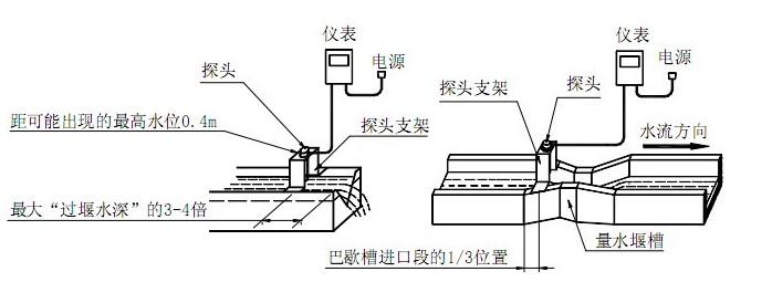 超聲(shēng)波明渠流(liú)量計的探(tan)頭可以直(zhi)接安裝在(zai)量水堰槽(cáo)水位觀測(cè)點的上方(fang)。探頭發聲(sheng)的一面要(yào)對準水面(miàn)。可以用水(shui)✏️平尺💞放在(zài)探頭上蓋(gai)上,通過校(xiào)上蓋水平(píng)使探頭對(dui)準水面。巴(ba)歇爾🥰槽水(shui)位🧡觀測點(diǎn)在距喉道(dào)2/3收縮段長(zhang)位置(如下(xià)圖的✂️La);三角(jiao)堰、矩形堰(yàn)在上遊一(yi)側,距堰闆(pǎn)3~4倍過堰水(shui)🐕深處。(如下(xia)圖)
