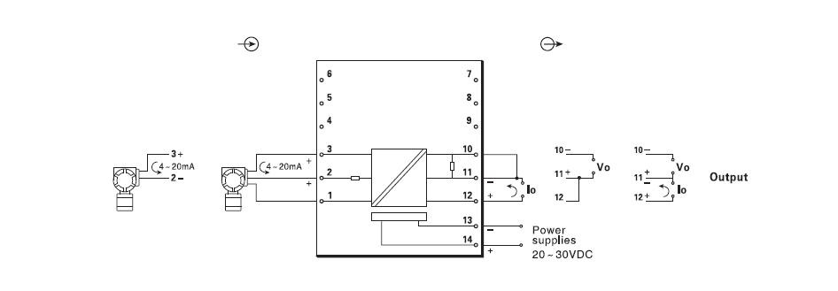 2、輸入回(huí)路: 輸入通道(dào):端子1,2,3接線(參(cān)見端子接線(xiàn)圖) 變送器信(xin)号㊙️輸🔅入:4~20mA 驅動(dòng)變送器的配(pei)電電壓:16.5~28V 輸入(ru)阻抗:内置輸(shu)入電阻50Ω